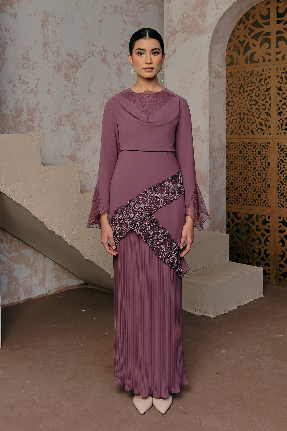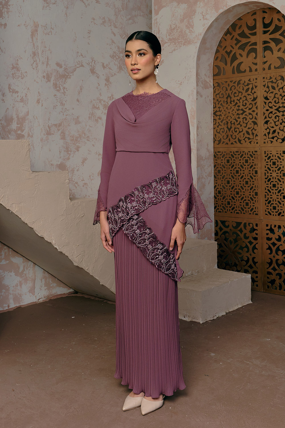 - Long Kurung with flower beaded lace