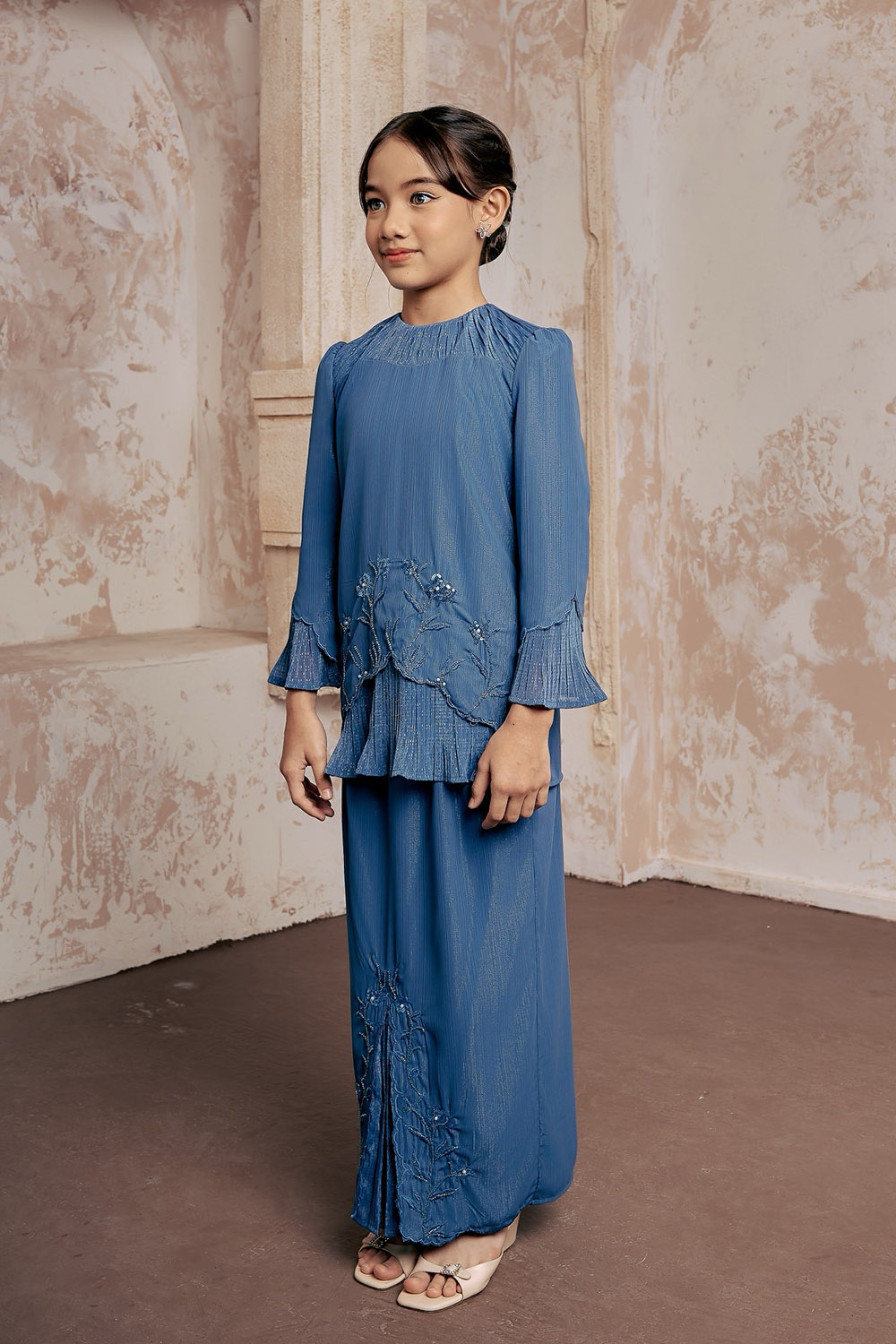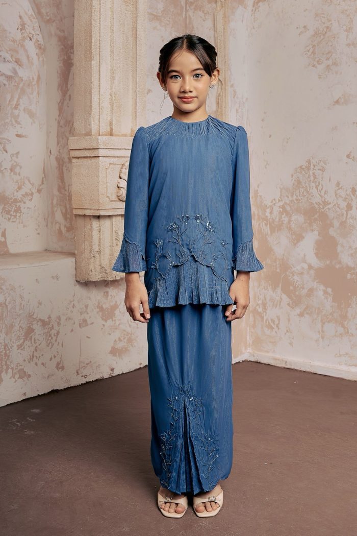Penelope Kurung Blue Color : Blue **Color may differ due to lighting and editing Custom Print Modern Kurung with flower embroidery & mesh pleated sleeve (Fully lined front top and skirt) Material Premium Organza. Fully lined. **cooling and breathable We will ship this item early February MEASUREMENT SIZE SIZE 1-2 3-4 5-6 7-8 9-10 11-12 Shoulder…